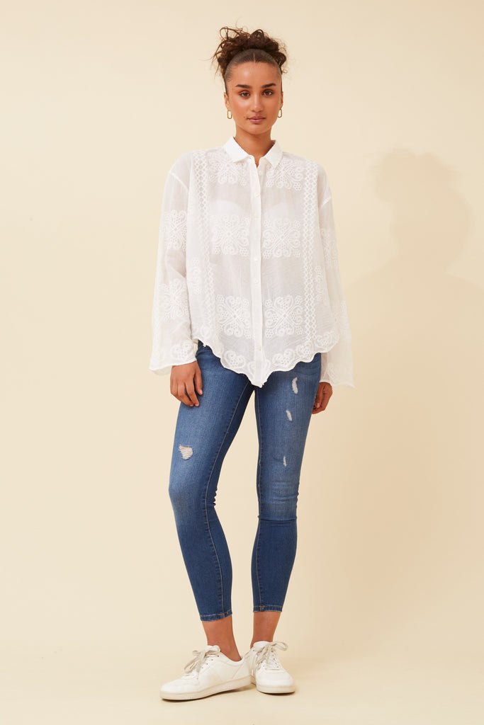 Embossed Cotton Shirt is a gorgeous 100% Cotton top. Featuring a shirt collar, long sleeves, scalloped hemline and sleeves, button through front, a stunning cool and comfortable cotton top.