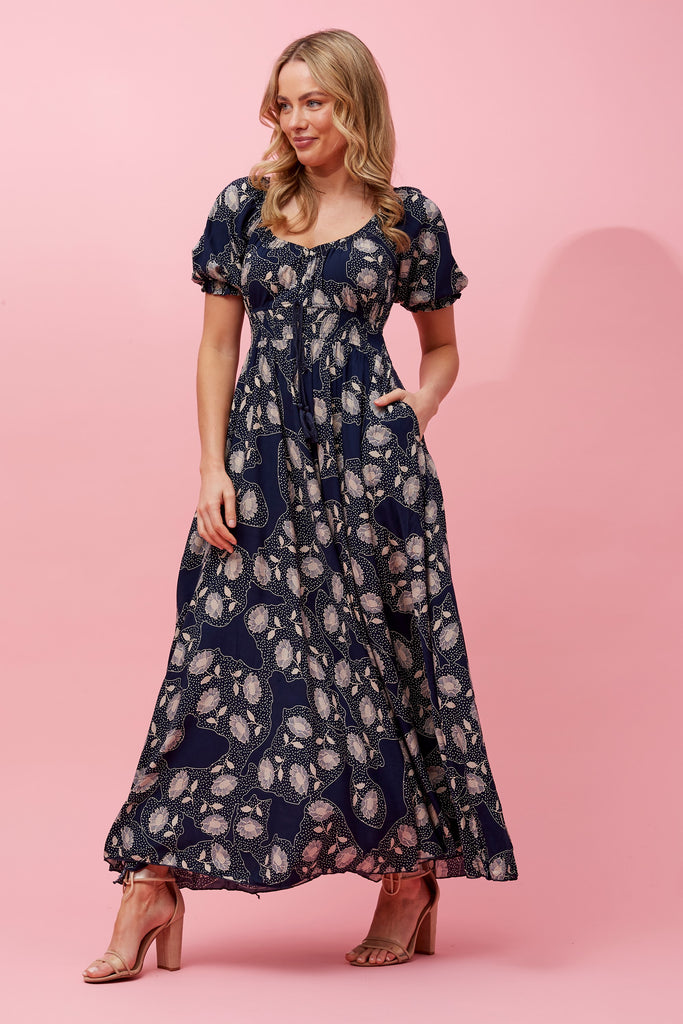 Erica Print Maxi Dress is a gorgeous navy based print perfect to add to your Summer dress wardrobe. Featuring a curved neckline, short puff sleeves, empire line from shirring under the bust, cord tassel, functional side pockets and a beautiful full A-line skirt.