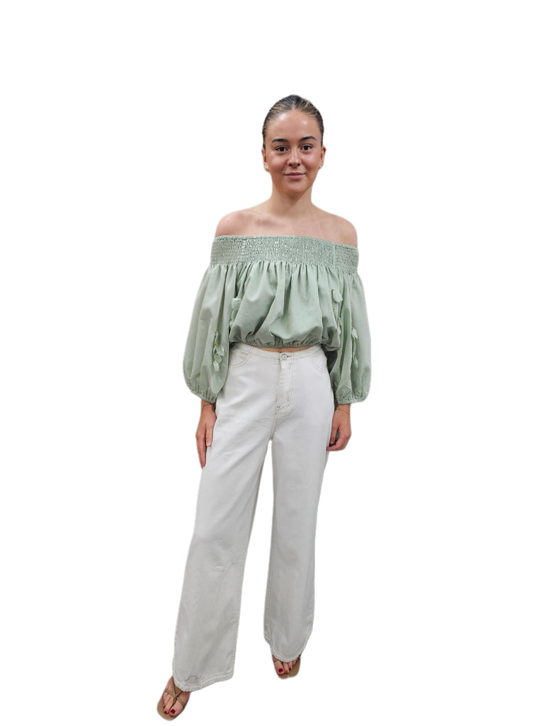 Francine Top Sage is a stunning top for any occasion. Featuring an on-off shoulder design, laser cut feature at front of top, lined.