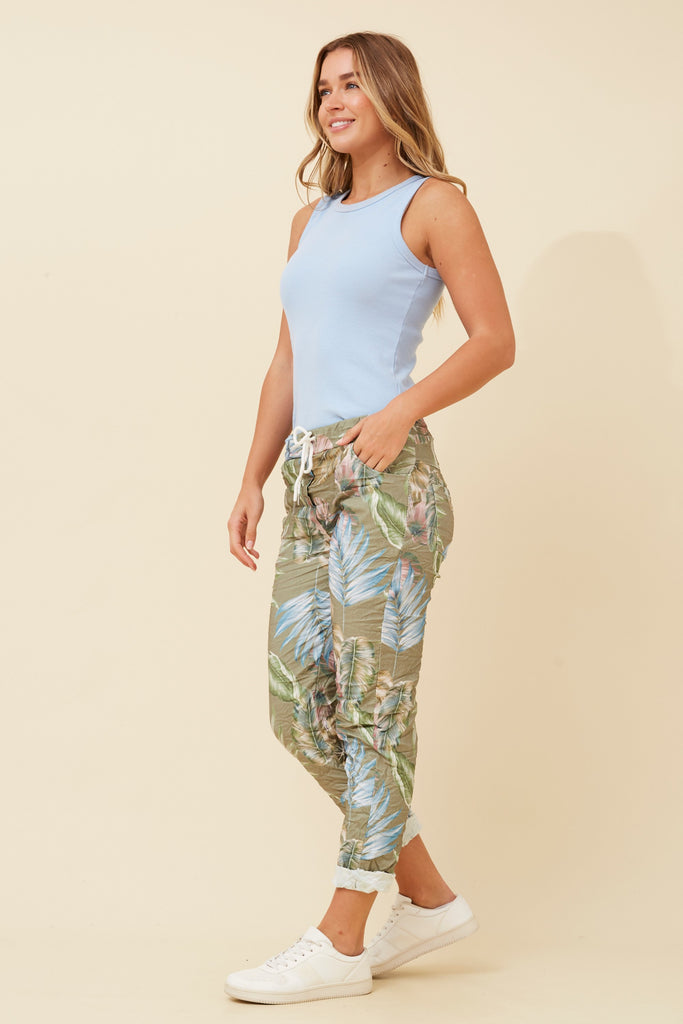 Italian Jogger Print Sage are a relaxed fit crushed stretch cotton and extremely comfortable jogger. Made in Italy. . Featuring elastic waistband with drawstring, side pockets, adjustable hem by turning the cuff up or down. A comfortable stretch cotton go-to pant, dress up or wear casual.