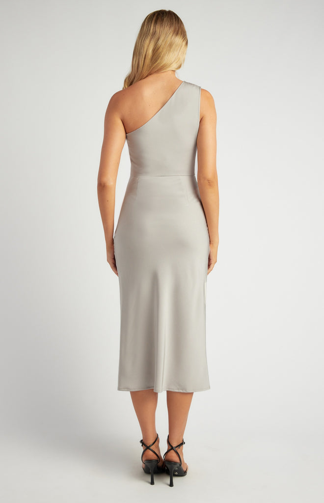 Laurel Cocktail Dress Stone is a stunning dress perfect for your next event. Featuring a one shoulder design, flattering rouching across overlay, lined, invisible side zip. Perfect for any occasion.