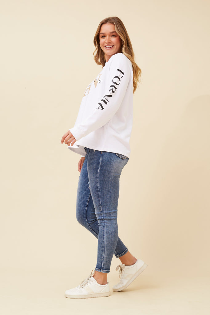 San Francisco Sweat White is a versatile French Terry graphic sweat. Featuring a crew neckline, long sleeves, black and gold placement San Francisco print, straight cuff and hem.